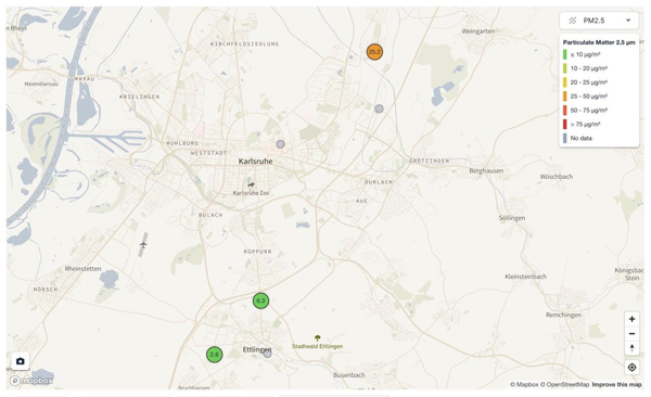 居民区可吸入的颗粒物数据目前还没有官方测量。作为空气污染控制研究的一部分,埃特林根(Ettlingen)以及斯图滕塞(Stutensee)居民区空气的污染程度被实时测量和比较。目前埃特林根(Ettlingen)的2 个测量点的空气受到可吸入细尘的轻微污染,但斯图滕塞(Stutensee)居民区的测量点显示出明显增加的值。空气中也弥漫着一股燃烧的气味——壁炉的烟雾污染了呼吸的空气。