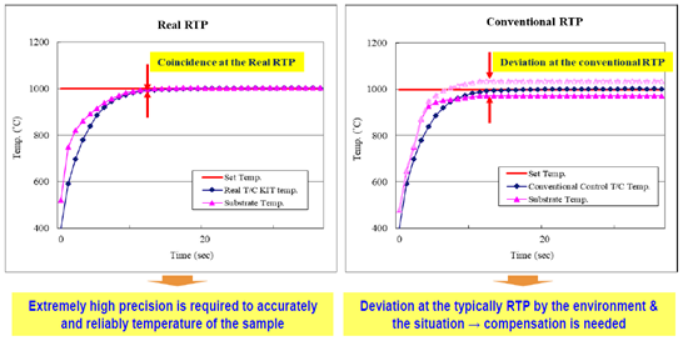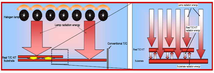 到达样品表面,样品被加热,片状Real T/C KIT同时被加热,由于基片与Real T/C KIT很近,它们之间也会进行热量传递,并很快达到热平衡,所以片状Real T/C KIT测量的温度就无限接近基片真实的温度,从而实现