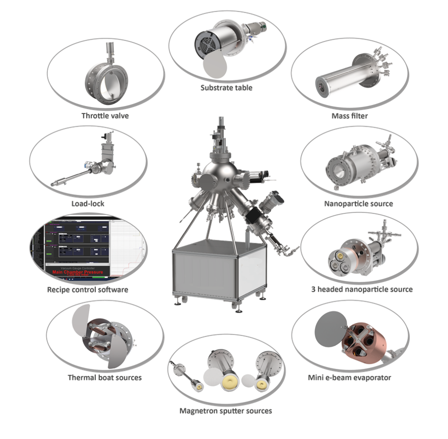 源类型 : 纳米颗粒源 /磁控溅射源、微型电子束蒸发器、热舟源、K 池、离子源、射频原子源